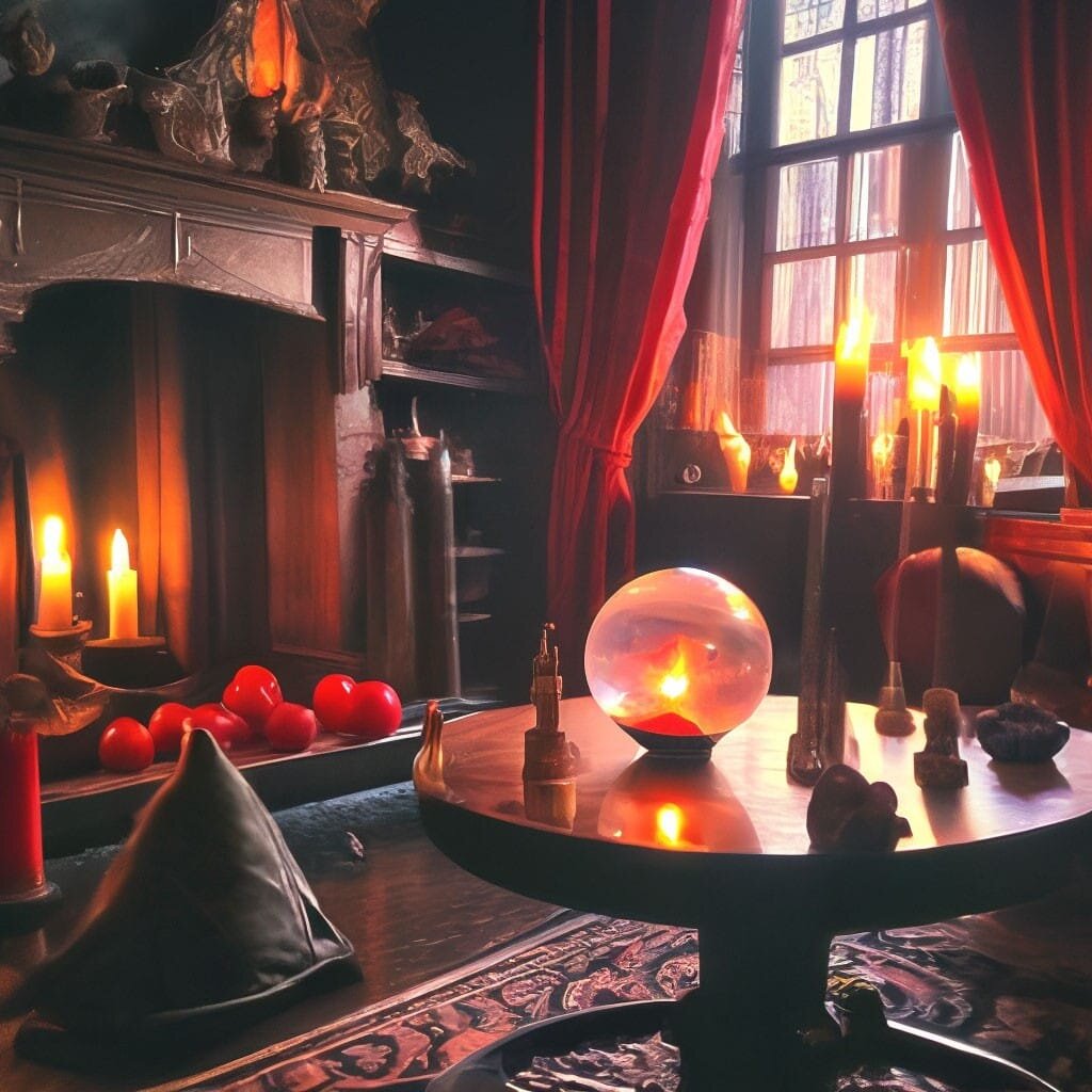 - Миша! - Позвал меня Васильчиков. Я заспешил на голос. Прошёл через тяжёлые тёмно-красные портьеры, попал в маленькую комнатку слабо освещённую жёлтой лампочкой. - Миша! - Из-за ещё одних портьер, отделанных золотом, услышал я голос Альфреда. Попал в другую комнату. В ней было темно, горели лишь свечи по углам, обильно были расставлены аромапалочки. Воздух в комнате был тяжёлым пропитан сладкими ароматами, у одной стены горел камин. Все стены были в коврах. У камина стоял кожаный диван. Посредине комнаты был стол, заваленный всякой ерундой. Старые книги, хрустальный шар. Перо павлина, зачем-то чернильница. Бамбуковые палочки, в углах висели пучки травы. Я посмотрел, ага, полынь, крапива, декоративный веник. В общем, атрибутика ведьмы, как её себе представляют многие.