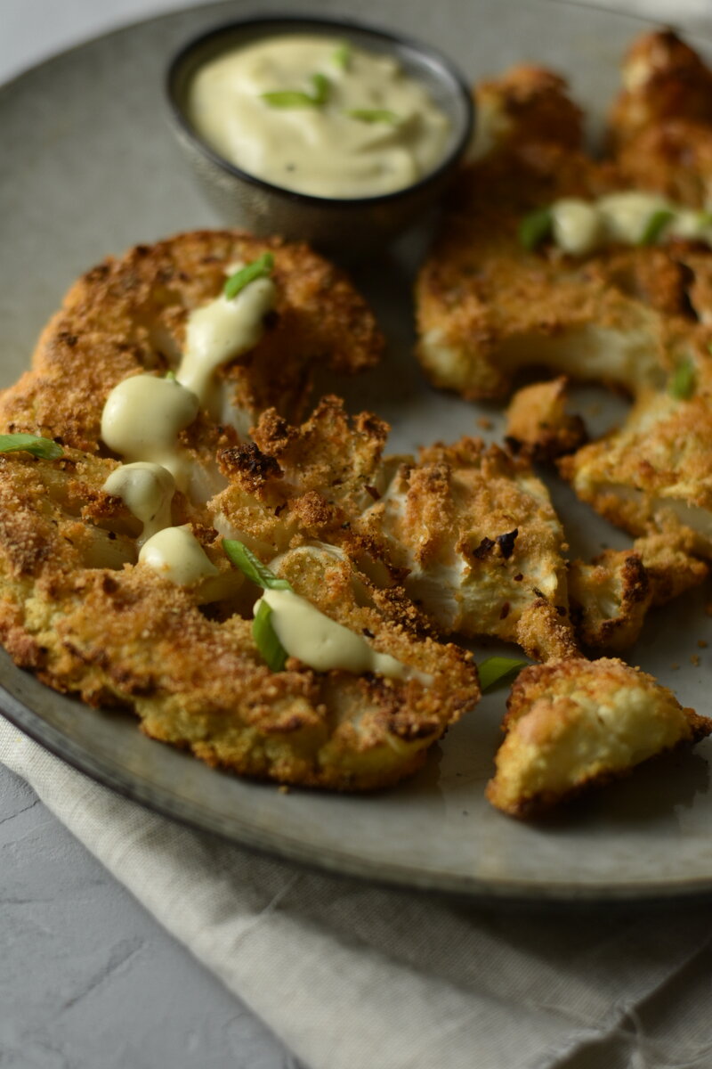 Вот рецепт, вроде бы ничего особенного, но на вкус бомба, а вдохновила Злата Панченко 🔥 каждый рецепт Златы всегда в самое ❤️ 🔻Цветная капуста 1 кочан 🔻Яйца 2 шт 🔻Панировачные сухари 🔻Соль 🔻Перец 🔻Копченая паприка 🔻Хлопья чили (по желанию) Кочан капусты нарезать на стейки по 2 см. В одной тарелке взбить яйца со всеми специями, в другую высыпать панировочные сухари. Стейки сначала окунуть в яйцо, и после поместить в сухари. Переложить в противень, посыпать ещё немного специями или кунжутом и запекать в духовке при 180 градусах 30-35 минут. Соус можно использовать любой, мне по душе соус на основе домашнего майонеза: майонез + чеснок + прованские травы + свежемолотый перец + щепотка чили. Съедаем сразу пока хрустит👌 #цветнаякапуста #стейк #стейкизцветнойкапусты
