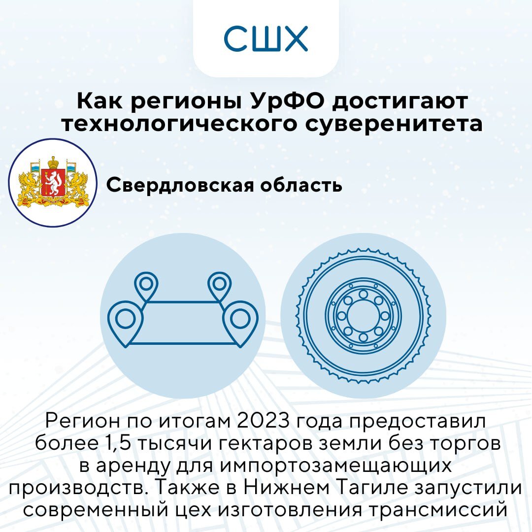 Свердловская область по итогам 2023 года предоставила более 1,5 тыс. гектаров земли без торгов в аренду для импортозамещающих производств. Участки получили предприниматели, производящие критически важную промышленную, строительную и сельскохозяйственную. Корпорация «Уралвагонзавод» в Нижнем Тагиле запустила современный цех изготовления трансмиссий — в рамках программы импортозамещения стал доступен полный цикл выпуска таких деталей. Это первый в новейшей истории тагильского предприятия цех, который возведен с нуля и оснащен под ключ. В ХМАО обсуждается создание производственного комплекса по выпуску фасонного проката мощностью 100 тысяч тонн в год. Инвестиции на первой стадии проекта оцениваются в 2,1 млрд рублей. Масштабный проект планирует реализовать «Сургутский металлургический комплекс». Тюменское представительство компании «Щелково Агрохим» активизировало работу по внедрению инновационных технологий в современное растениеводство. В числе направлений работы: выпуск средств защиты