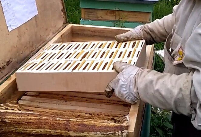 Такой вариант работает, но это эксперимент, так сказать лабораторный образец, и несколько неудобен, точнее для меня совсем неудобен оказался. На сегодняшний день я предлагаю другие варианты получения секционного мёда как в рамках Владимирского улья-лежака, так и в вариан