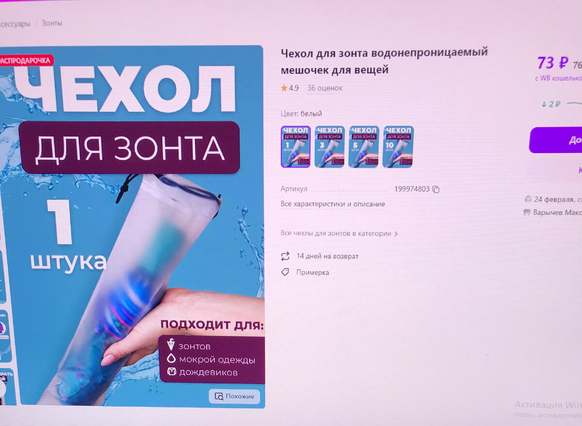 Пишут, что подходит и для мокрой одежды, дождевиков, но я использую только для зонта. Не знала, что такая полезная вещица. Раньше постоянно думала, куда зонт мокрый пристроить. А тут, пожалуйста, все предусмотрено, даже завязки у чехла есть. Завязал и в сумку кладешь, ничего не намокает. Или же можно и в руке нести, за веревочки, при желании. Или в автомобиле, в чехле мокрый зонт везде можно пристроить. Кстати, много разных вариантов чехлов сейчас на Вайлдберриз есть, на любой вкус. А цена, очень даже доступная.