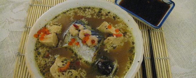 Горячий сборный мясной суп с рыбой и капустой, хотя это тоже вызывает споры, разливаем по тарелкам, а вот есть его по традиции принято с вареным рисом... Пробуйте!