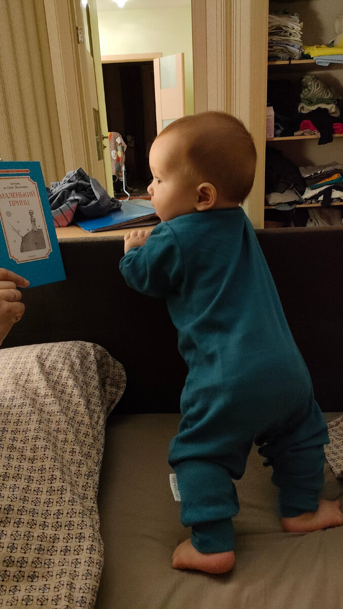 Уоу!!!! Вот это неделька была. Сначала мне казалось, что Санины капризы связаны с грядущими зубами, но все оказалось куда более интересно. В субботу утром он ещё беспомощно лежал у порога и не мог понять, как же закинуть на него обе руки одновременно. Методично подымал то левую руку, то правую. Бабушка из сострадания показала внуку, как совладать со страхом и положить обе руки повыше. И после обеденного сна Саня уже ловко залес ко мне на колени, когда я сидела рядом с ним на коврике. Ещё через пару дней он смог вскарабкаться целиком и буквально через неделю уверенно встал на ноги и выпрямил коленки! Нашему и его восторгу не было предела!!! Так вот предвестником чего были те пару капризных дней! Сашка стал совсем большим. И теперь он ещё любопытнее и смелее. Ему сложно расстаться с мамой и папой. Теперь он пару минут грустно смотрит на дверь, когда папа уходит на работу, протестует и несётся ко мне на кухню или в ванную, если остаётся один, не хочет спать днём без меня и предпочитает в