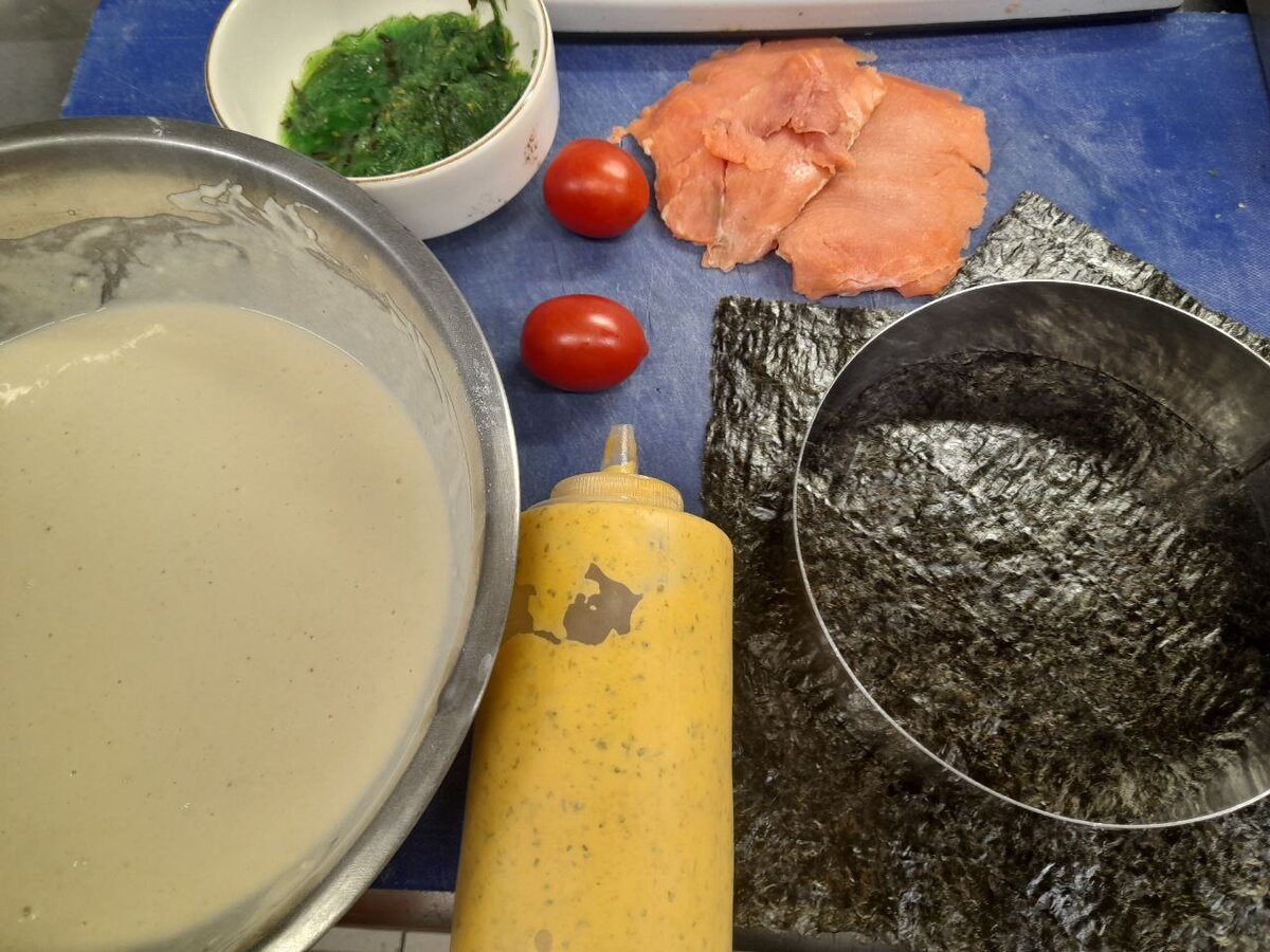 Для романтичного ужина подойдет отлично недавно введенное в наше меню тако из листов нори. По вкусу как горячие суши, подача иная и оригинальная. Приступим: Нам понадобится: Замешиваем кляр. На 100 грамм муки темпуры понадобится 150-200 грамм обычной воды, смотрите чтобы было не слишком жидко. Далее вырезаем по любой круглой форме из листов нори круглые заготовки. Далее аккуратно кладем круг нори в кляр, так чтобы тесто покрывало только одну сторону, не задевая верхний слой. Осторожно поднимаем, немного стряхиваем лишний кляр и окунаем во фритюр. В домашних условиях просто в кастрюлю с кипящим маслом. Многих отталкивает делать домашний фритюр, так как жалко тратить столько масла, но поверьте этого масла вам хватит еще на многие рецепты, ведь масло не нужно выливать сразу после первой же жарки или после остывания домашнего фритюра. Любым подручным предметом нажимаем в середину нори как бы складывая такую лодочку и держим пока кляр не схватится. Как только появится золотистая корочка - у