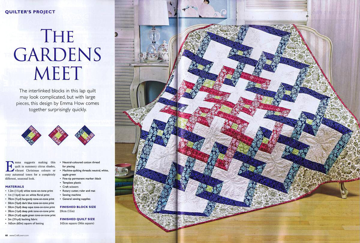 Полистаем журналы и найдем идею которая вдохновит. Знакомо? Интернет позволяет перелистывать страницы многих журналов гораздо быстрее, хотя и идей тоже больше чем в журнале и выбрать бывает сложнее. Но если уж что-то запало, то хочется разобраться как сшить лоскутное одеяло или лоскутный блок. Вот и мне на просторах всемирной паутины повстречалось вот такое лоскутное одеяло. Называется оно «Встреча в садах», Но вот беда, нашла его на иностранном ресурсе как страница из журнала, поэтому с описанием процесса возникли сложности. Хотя, Надежда, к которой я обратилась сказала что это одеяло собирается очень быстро, поскольку детали крупные и выглядит сложнее, чем есть на самом деле., но нужно очень тщательно подбирать нужные ткани в определенных местах, иначе эффект будет потерян. Основа всего узора лоскутного одеяла такой вот блок: Процесс шитья происходит по принципу незавершённый шов, когда не дошивается до конца, оставляется полоса ткани, собирается блок, в конце пришивается оста
