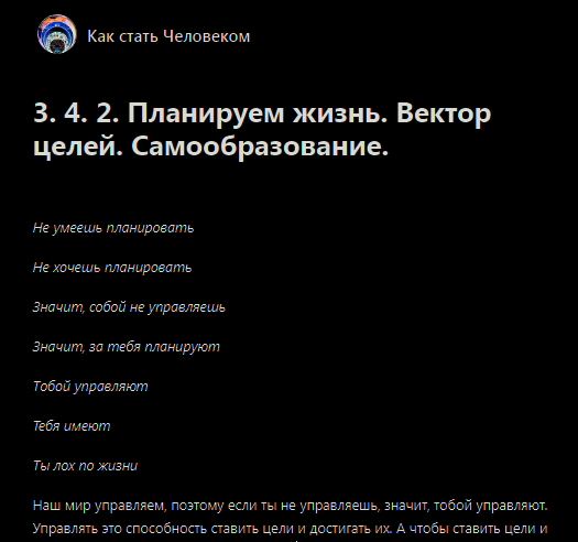 Он должен уметь разбирать весь свой день, составлять обобщенный план, выявлять обязанности по жизни и планируемые задания, которые будут повторяться, так, чтобы это всё, что выбирается, соответствовало бы вектору целей и концепции (способу достижения) на все периоды. То есть на периоды – день, неделя, месяц, год, 5 лет, 10 лет, 25, 50, 75, 100, 125 лет (обязательно для долгожительства).