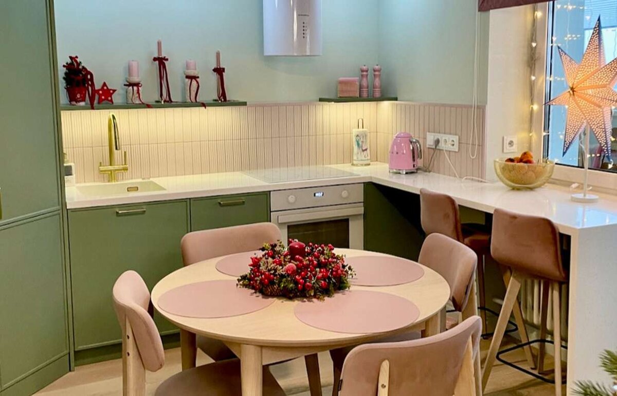 Функциональные и стильные идеи для вашего дома Из обычной однокомнатной квартиры дизайнер Татьяна Красикова сделала двушку с изолированной спальней, гостиной, двумя кухнями (!) и гардеробной. Красивое цветовое решение, много мест для хранения, интересные элементы в отделке привнесли в интерьер уникальность. Рассказываем, какие идеи можно взять на заметку и реализовать в своей квартире. 1. Розовые и зеленые оттенки в отделке и мебели Красивый тандем пыльной розы и холодного зеленого смотрится весьма гармонично, а интерьер в таких красках выглядит утонченно и стильно. Эту цветовую пару поддержали дополнительными цветами: белым, золотистым, оттенком светлого дерева. Это сделало пространство еще более выразительным и интересным. 2. Кухня с секретом Главная фишка квартиры — вторая кухня, скрытая за фасадами большого шкафа. Она оборудована полноценным рабочим местом, розетками для техники, полками для хранения и даже винным шкафом. Такое решение позволило замаскировать технику и кухонную утв