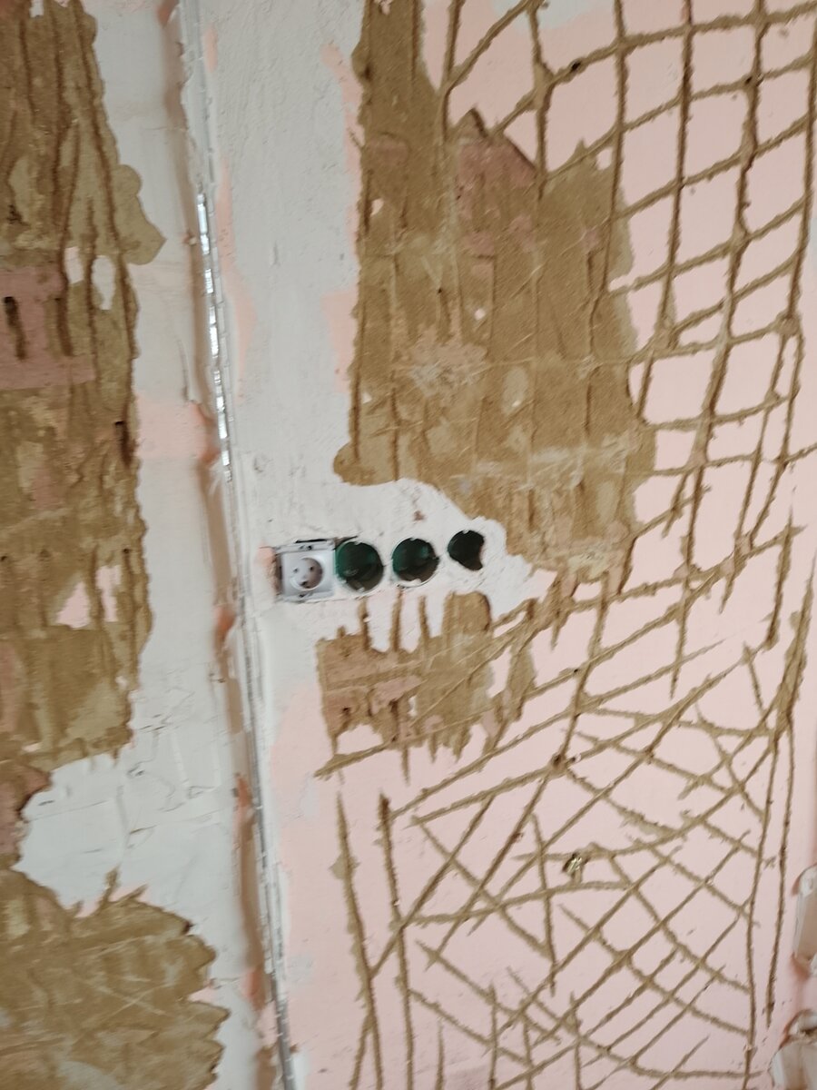 Здравствуйте! Пока заказчица красит стены в кухне, готовит ее к навеске и установке шкафов, я опять по немногу мусорю и ломаю. Дошли руки до стены, перегородке. Хотел ее штукатурить, немного только краску побелку сшибить, а начал, пришлось сшибать все. До кирпича, сэкономить не получилось.