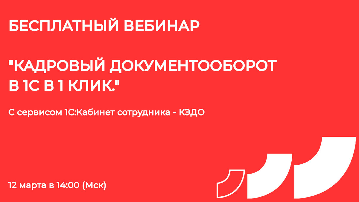«Кадровый документооборот в 1С в 1 клик». С сервисом 1С: Кабинет сотрудника – КЭДО 12 марта в 14:00 (Мск). РЕГИСТРАЦИЯ • Тратите много времени на ознакомление сотрудников с кадровыми документами? • Из-за кипы бумаг на столе забыли, как выглядит ваш коллега-кадровик? • Приходится обзванивать сотрудников "на удалёнке" и вызывать их в офис для подписания приказов? • Ваша компания работает в разных регионах, рассылаете по почте кадровые документы для ознакомления, и они часто теряются? Все эти проблемы позволяет решить КЭДО! (Кадровый электронный документооборот). Он поможет сэкономить время, ресурсы, а также соблюдать законодательство и надежно хранить электронные юридически значимые кадровые документы. Вам точно нужен 1С: Кабинет сотрудника – КЭДО, если: • Кадровый учет ведётся в 1С • Большое количество сотрудников и кадровых документов • Дистанционные сотрудники • Частые командировки сотрудников • Географически распределенная структура • Вахтовый метод работы • Отсутствие центрального о
