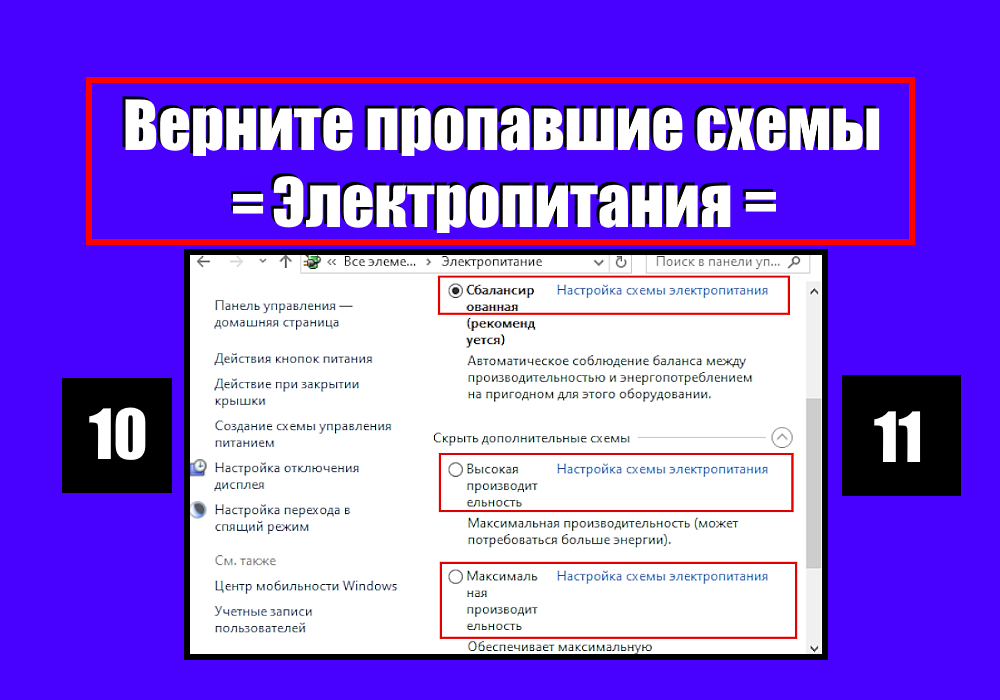 Схемы можно восстановить следующими способами: Активируйте схему "Высокая производительность" или "Энергосбережение - Экономия энергии" и "Максимальная производительность". Команда должна быть выполнена в командной строке от имени администратора.