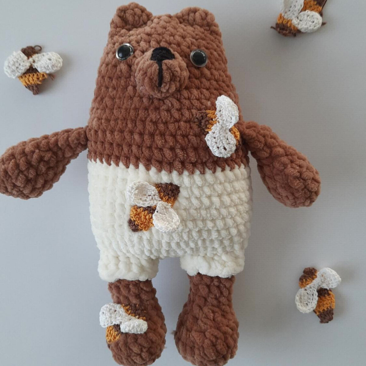 Медвежонок, который очень любит мед. Мягкая игрушка связанная крючком из плюшевой пряжи для детей от 6 мес до 6 лет для игры, обнимашек и сна в обнимку с мишкой.