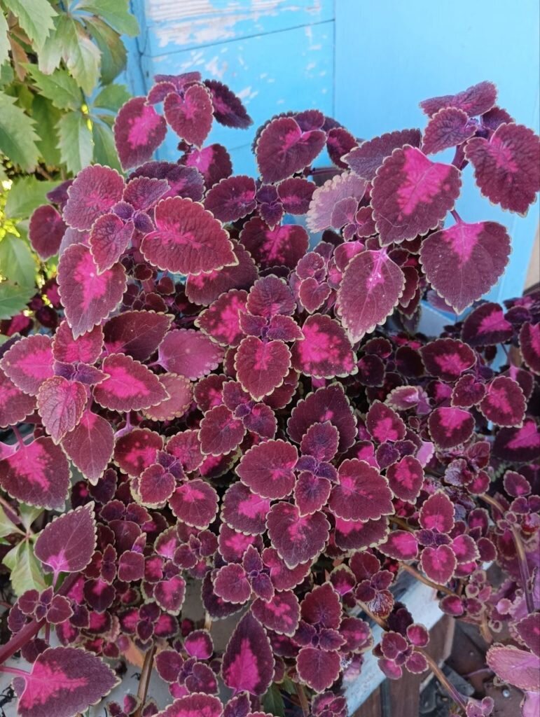 Яркие, разноцветные колеусы становятся всё более популярными растениями среди цветоводов и дачников. Это декоративно-лиственные растения, относятся к семейству Яснотковые. Народное название- комнатная или декоративная крапивка, так как, листья похожи на листву крапивы. В отличии от крапивы листья у колеуса не обжигают, они бархатистые, яркие, разного окраса, трёхцветные или двухцветные, основной окрас зелёно-розовый. Выведено много сортов с коричневыми, белыми, желтыми, лиловыми, оранжевыми узорами. Листва очень красивая, декоративная, а вот цветение невзрачное. Во время цветения на верхушках веточек появляются колоски с мелкими губчатыми цветками голубых оттенков. Цветение плохо влияет на колеус, веточки вытягиваются, изгибают