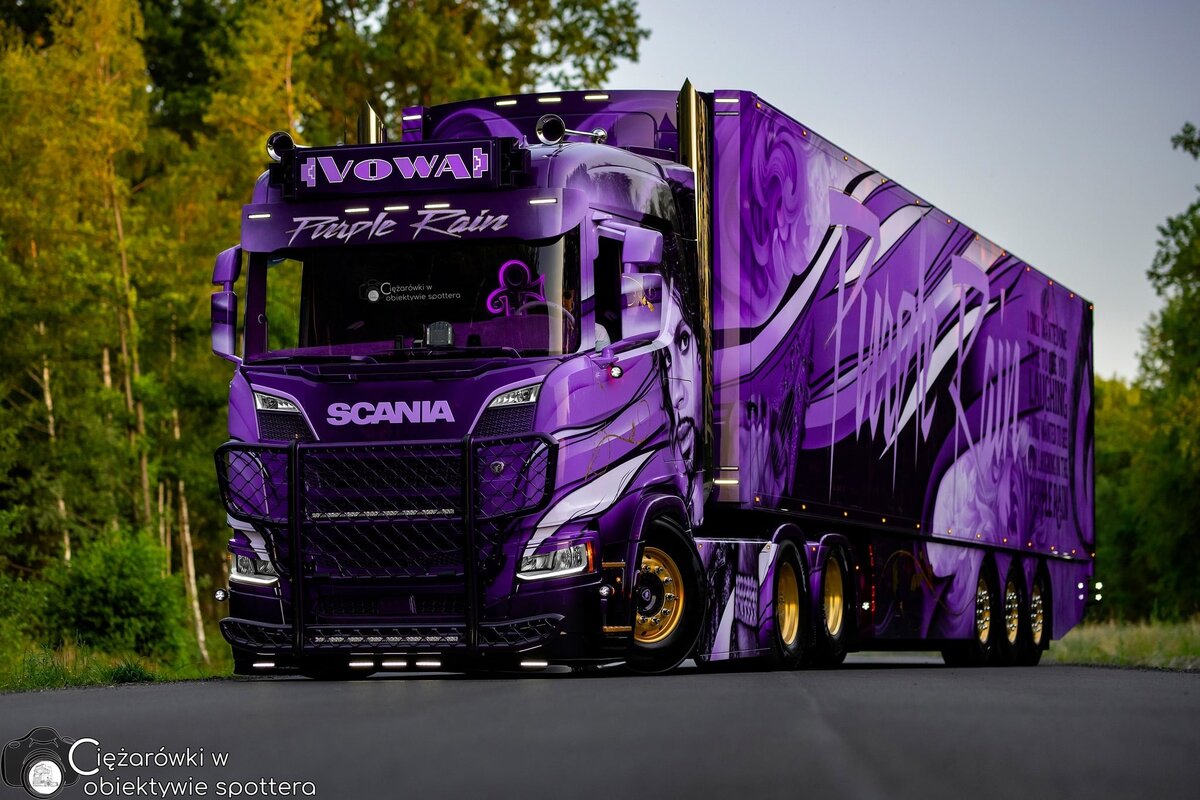 Сегодня расскажу вам про один очень красивый модифицированный грузовик — Scania R650 от швейцарской компании VoWa Transport, при создании которого вдохновлялись песней Purple Rain американского певца Принца. Цель создания необычного автопоезда состояла в том, чтобы выделиться и сделать грузоперевозки особенными. Купленный в начале 2019 года тягач был немедленно доставлен специалистам из Steve's Place — мастерской по тюнингу грузовиков в Нидерландах. Полностью черный Scania получил боковые обтекатели, за которым скрывается шасси и топливные баки, у него были демонтированы дверные ручки, выкрашены в золотой цвет колеса, а на выхлопных трубах выгравирована надпись «Purple Rain». Прицеп-рефрижератор производства Schmitz Cargobull был построен по индивидуальному заказу и также получил обтекатели, скрывающие шасси, опоры и паллетный ящик. Внутри кабину обшили фиолетовой алькантарой, прошитую золотыми нитями. Пластиковые детали были окрашены в ярко-фиолетовый цвет. Аэрография была выполнен
