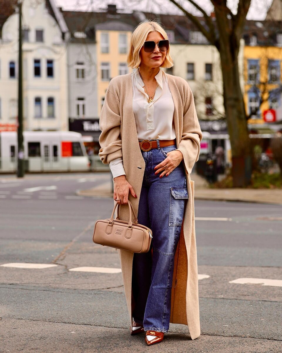 Бежевый нельзя назвать «капризным» цветом, ведь его очень просто стилизовать. Одежда в теплых тонах создает ощущение комфорта, расслабляет. Давайте сегодня рассмотрим 10 нескучных комплектов на весенний сезон, которые идеально подходят модницам старше 50. Длинный бежевый кардиган выглядит эффектно и дорого, несмотря на лаконичный крой. Светлая блузка добавляет наряду женственную нотку, а джинсы делают его практичнее. В одном образе можно сочетать разные оттенки бежа. Длинный серый шарф создает стройнящую вертикаль в образе. Повседневный сет целесообразно завершить удобными кедами. С помощью блестящей юбки-карандаш можно «оживить» даже самый будничный ансамбль, сделать его наряднее. Чтобы зрительно добавить роста, заправьте белую рубашку за пояс и завершите образ высокими сапогами на устойчивом каблуке. Кремовая водолазка чудесно ладит с брюками приятного оливкового оттенка. Вязаный свитер, небрежно накинутый на плечи, повышает градус стиля, белые кроссовки и сумка из кожи ничуть не выб