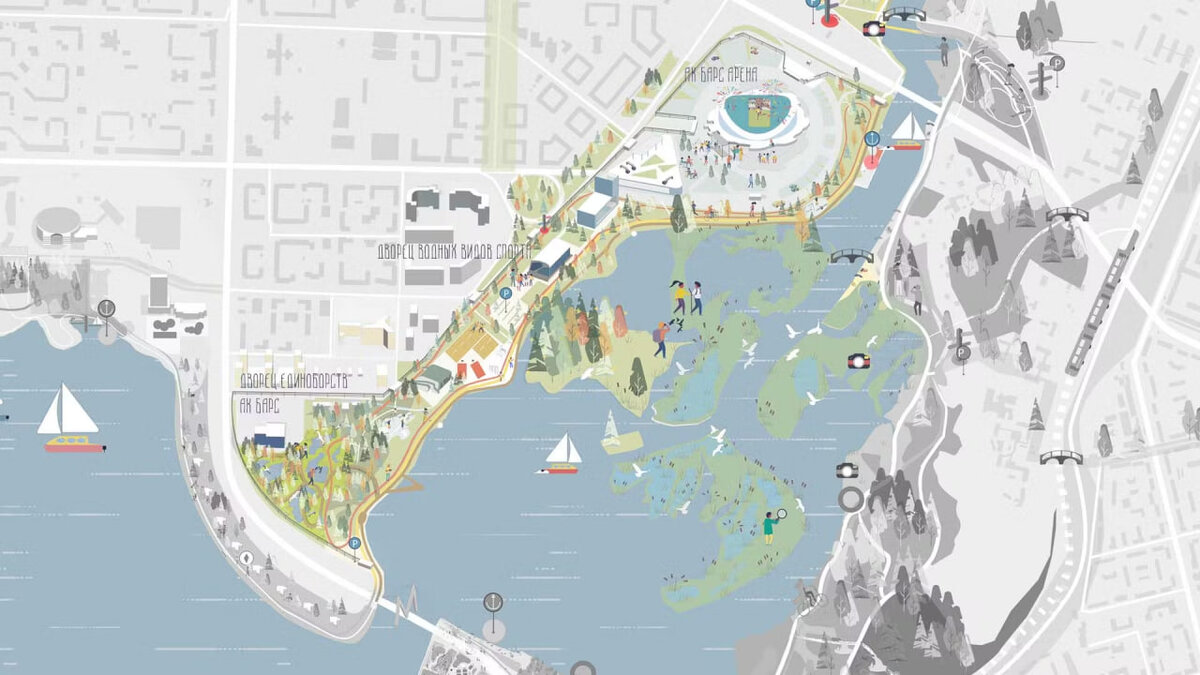 Его возведут на берегу Казанки рядом с Дворцом водных видов спорта. В парке будут площадки для командных игр, воркаут-зоны, пространства для детей и беговой трек на 5 километров.