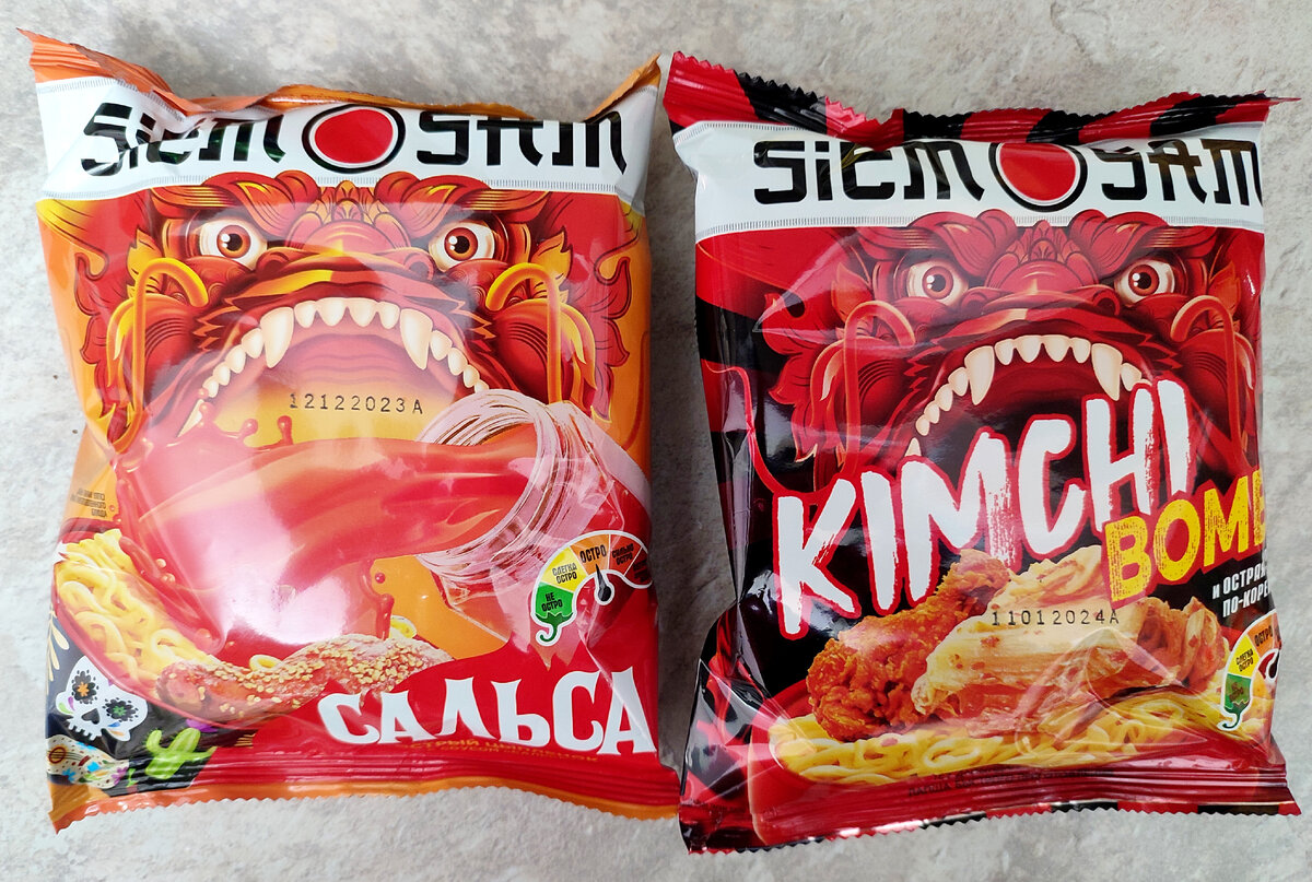 Всем привет! Сегодня пробую две острых новинки от казахского бренда SiemSam. Вся их лапша очень красиво оформлена. Так и просится в корзину. На обзоре сегодня вкусы Острый цыплёнок с соусом Сальса и Кимчи и острая курица по-корейски. Покупал по 45 рублей. Начнём с Цыплёнка в соусе Сальса. По остромеру она будет средне острая. Лапша 90 грамм. Размер не маленький и не большой. Среднячок. Лапша замешана без пальмового масла. Это плюс. В суповой основе много различных специй. Не обошлось без любимого глутамата натрия. Есть сушёные овощи, такие как зелёный лук, морковь,, пекинская капуста и зелёный перец. Также много ароматизаторов: Сальса Верде, кинза, томат, кетчуп, чили, горчица, огурец маринованный, жареный лук, жареная курица и куриный жир. Собрали тут всё что можно и нельзя. В комплекте знакомая лапша, сушёные овощи, специи и соус. Вилки нет. Закладываем все ингредиенты в подготовленную ёмкость. Заливаем кипятком и через 5 минут готов ароматный суп. Эта лапша понравилась. Пр