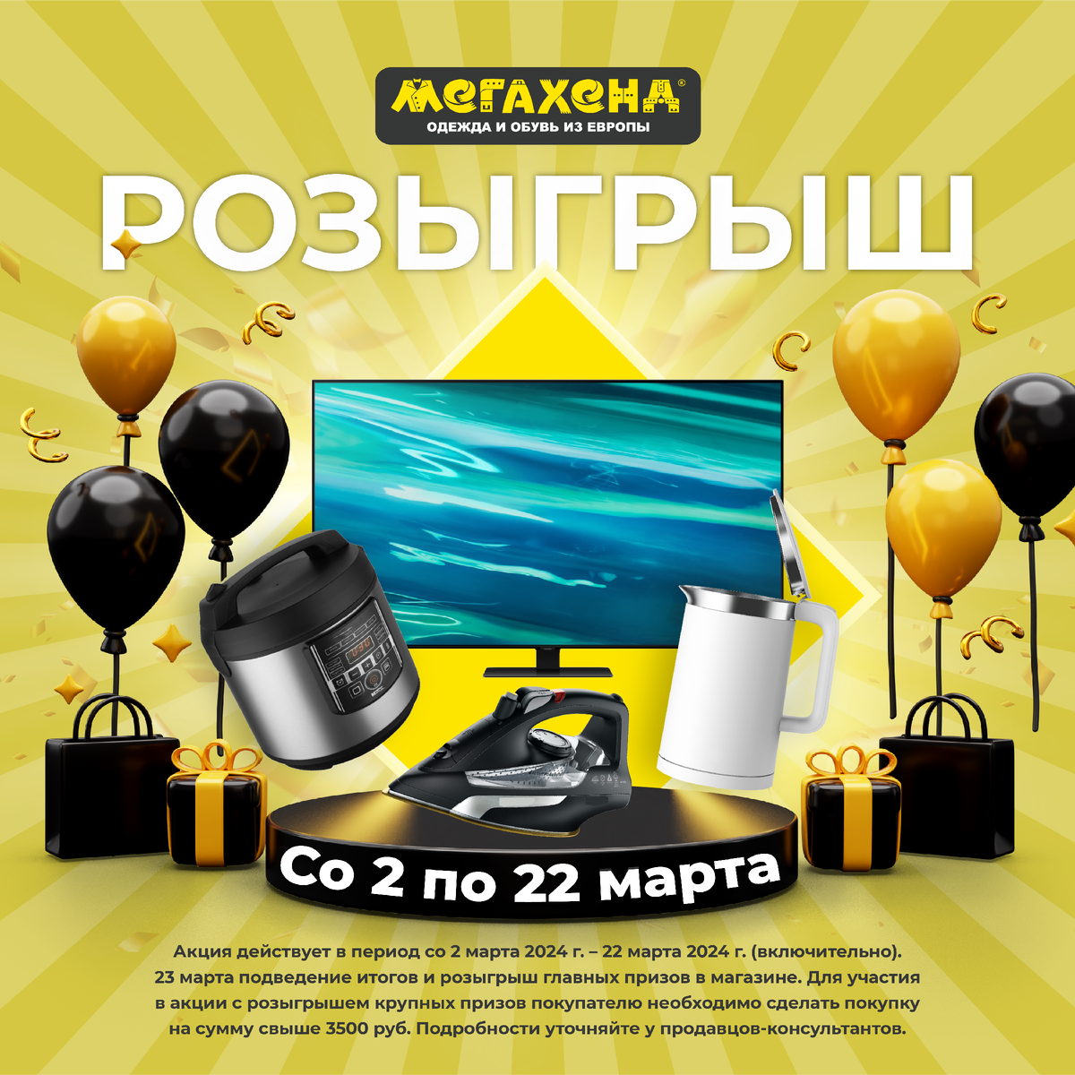 - Со 2 марта 2024 г. – 22 марта 2024 г. (включительно). 23 марта подведение итогов и розыгрыш главных призов в магазине – условия для магазинов Смоленск и Волжский;