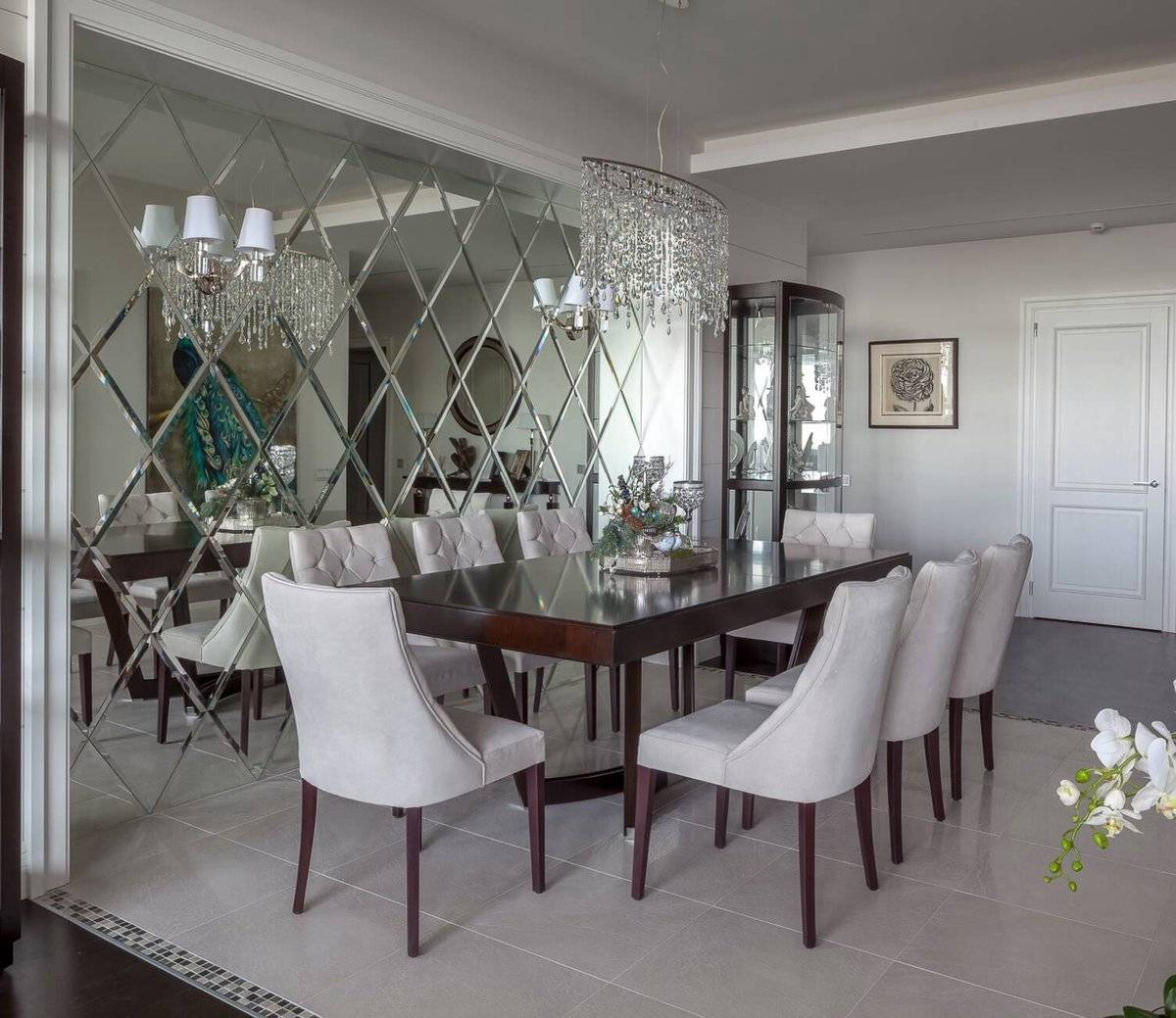 Использование стекла и зеркал в интерьере является не только стильным решением, но и практичным способом расширения визуального пространства. Этот прием позволяет нашим дизайнерам творчески подходить к оформлению жилых и коммерческих помещений, добавляя света, глубины и элегантности. Расширение пространства Зеркальные поверхности служат идеальным инструментом для визуального увеличения помещений. Их стратегическое расположение может сделать небольшие комнаты более просторными и светлыми. Зеркала, установленные напротив окон, отражают дневной свет, эффективно освещая темные углы и увеличивая общую освещенность интерьера. Создание акцентов Современные технологии позволяют использовать стекло и зеркала не только в качестве функциональных элементов, но и как декоративные акценты. Витражи, зеркальная мозаика, стеклянные перегородки с узорами и фактурами могут стать яркими деталями интерьера, добавляя уникальности и стиля. Иллюзия пространства Особенно актуально применение зеркал в интерьера