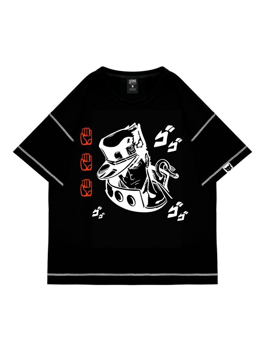 В бренде появилось много новинок, и сайт пополняется неожиданными дизайнами. Ну и куда ж без мини-презентаций нашей одежды! Сегодня мы вам расскажем про наш собственный ЖОЖО референс — чёрную футболку с узнаваемой отсылкой! Мимо аниме и манги «Джо Джо» пройти невозможно. Да и вообще, кто в нашем современном интернетном мире, что весь полнится мемами, не знает про эти «необычные приключения» брутальных мужиков с их абсурдным юмором, динамичными боями и «ОРРРА ОРА ОРА ОРААААА»? Эти крики — икона. «Невероятные приключения Джо Джо» — популярнейшее аниме, что встаёт в одну линию известности с Наруто и Токийским гулем. И не удивительно! В Джо Джо очень необычная рисовка, одна из самых узнаваемых во всей аниме индустрии, а почти каждый персонаж — лютый гигачад с мускулами, брутальными чертами лица и неординарным характером. Более того, то, как прорисованы и анимированы бои в этом тайтле — тоже уникальная вещь. Они никогда не повторяются. Да, у каждого персонажа есть свои какие-то масштабные с