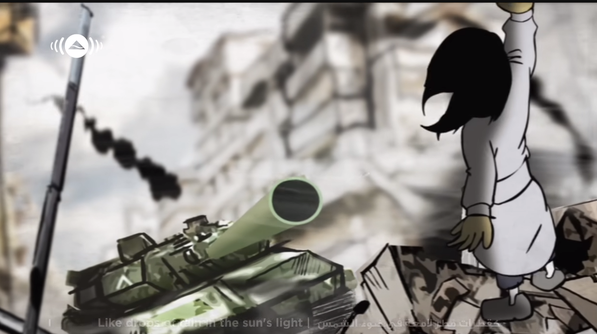 Поет он тут на английском. Для тех, кто плохо понимает английский со слуха, есть субтитры. Много символов. Но в мультике все кончается хорошо. А нашу девочку с тремя ранениями, которую уже смогли забрать медики и которую повезли в больницу, танк того. Ибо это вам не мультфильм.