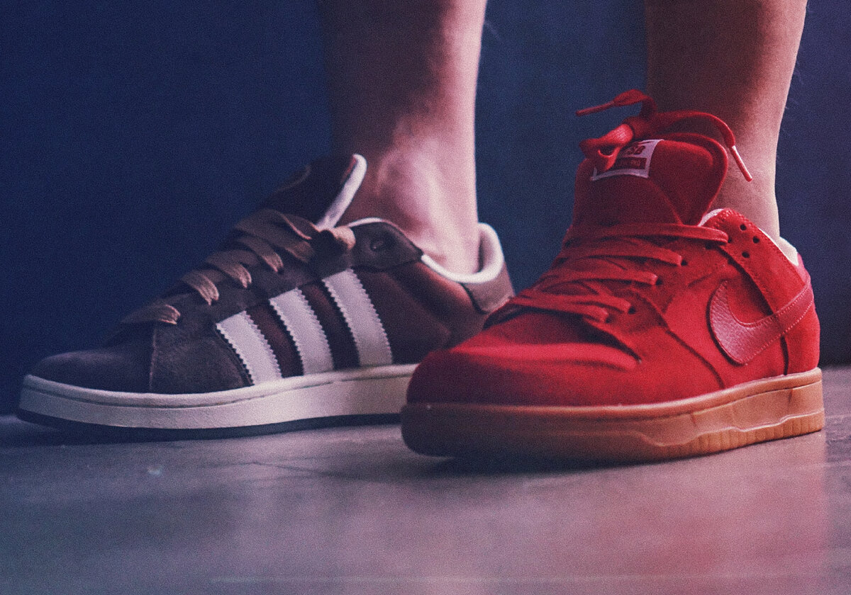 Nike Dunk сделан из замши и парусины, а adidas Campus полностью выполнены из замши, или, как в нашем случае, из замши и материала кордура. Замша у adidas, чуть более мягкая и ворсистая, чем у Nike, но эти отличия практически не заметны.