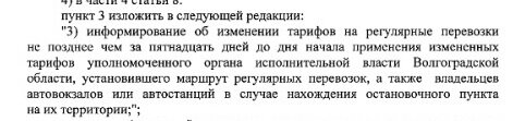 На сайте губернатора были опубликованы изменения, которые внесли в закон о вопросах организации регулярных перевозок по межмуниципальным и муниципальным маршрутам регулярных перевозок пассажиров и багажа автомобильным и городским наземным электрическим транспортом. В документе четко прописали, что волгоградские перевозчики обязаны уведомлять о подорожавшем проезде заранее. Так, один пунктов регионального закона изложили в новой редакции. В нем говорится, что информирование об изменении тарифов на регулярные перевозки должно происходить не позднее чем за 15 дней до того дня, когда они начнут действовать в реальности. Уведомить в этот срок перевозчики обязаны не пассажиров, а уполномоченный орган исполнительной власти Волгоградской области, установившего маршрут регулярных перевозок. А также — владельцев автовокзалов или автостанций, если остановка находится на их территории. Ко всему прочему, в региональном законе теперь прописали отдельно случаи, когда орган власти, выдавший свидетельс