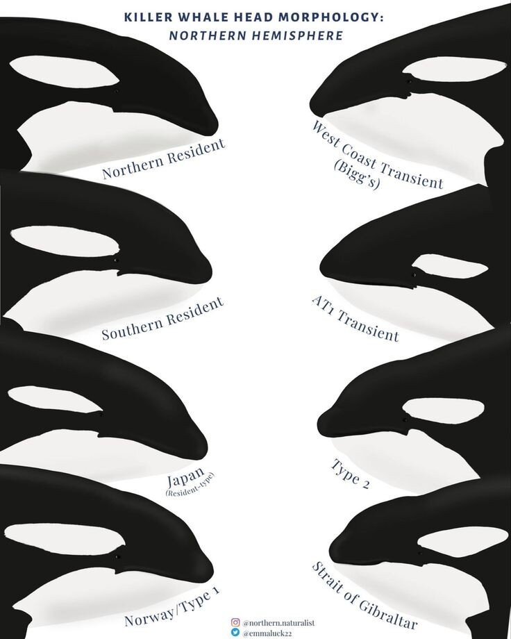 Косатки, как и люди, различаются по своему фенотипу. Размеры, окрас, форма и высота спинных плавников, форма мордочки, даже нижние челюсти с зубами тоже у всех по своему строению разные в зависимости от типа.