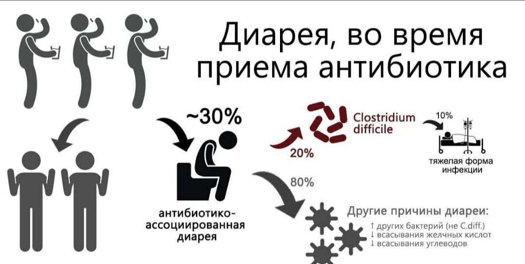 1. У каждого третьего человека при приёме антибиотика появляется жидкий стул 2. Чаще всего это реакция проходит самостоятельно 3. Опасность представляет только инфекция Clostridium difficile (20% случаев диареи) 4. Риск этой инфекции повышен у людей после 65, пациентов, получающих химиопрепараты и иммуносупрессоры, людей с несколькими хроническими заболеваниями или у воспалительным заболеванием кишечника. 5. Для профилактики клостридиальной инфекции пациентам из "группы риска" (п. 4) имеет смысл вместе с антибиотиком принимать пробиотики (тратить деньги на пробиотики не нужно 6. Доказательства необходимости принимать Флуконазол и другие противогрибковые препараты на период лечения антибиотиками отсутствуют 7. Повальное профилактическое назначение пробиотиков вместе с антибиотиком не рекомендовано НИ ОДНИМ клиническим руководством