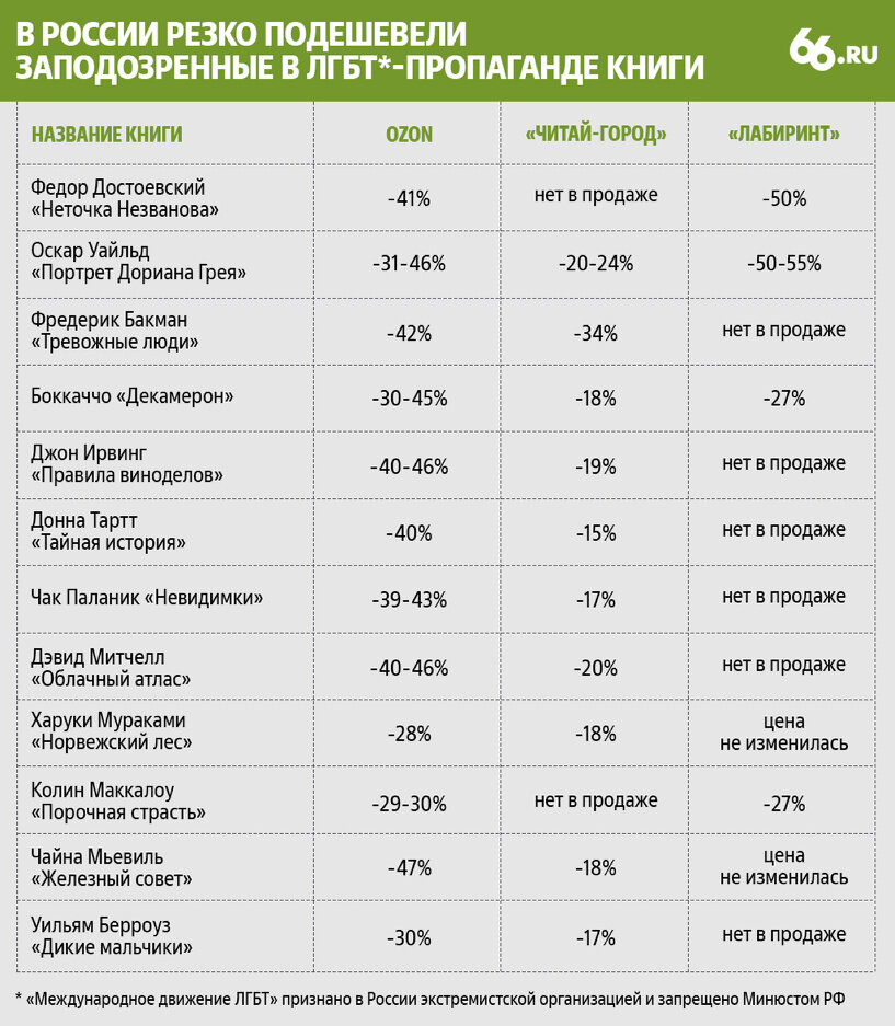Поставщики маркетплейса Ozon, интернет-магазины «Читай-город» и «Лабиринт» начали снижать цены на книги из списка, включающего произведения Федора Достоевского, Стивена Кинга, Харуки Мураками, Марселя Пруста, Оскара Уайльда, Стефана Цвейга и других авторов. Два дня назад «Мегамаркет» заявил, что убирает эти издания с витрины, опасаясь обвинений в ЛГБТ-пропаганде. По данным на 22 февраля, роман Достоевского «Неточка Незванова» подешевел на 40–50%, «Портрет Дориана Грея» Оскара Уайльда — на 30–55%, «Тревожные люди» Фредерика Бакмана — на 34–56%, «Декамерон» Боккаччо — на 30–45%, «Правила виноделов» Джона Ирвинга — на 19–46%, «Тайная история» Донны Тартт — на 15–40%, «Невидимки» Чака Паланика — на 17–43%, «Норвежский лес» Харуки Мураками — на 18–28%, «Облачный атлас» Дэвида Митчелла — на 20–46%. По версии «Мегамаркета», перечень из 250 книг, к которым надзорные органы могут предъявить претензии, составили участники Ассоциации компаний интернет-торговли (АКИТ) в декабре 2022 года, когда в