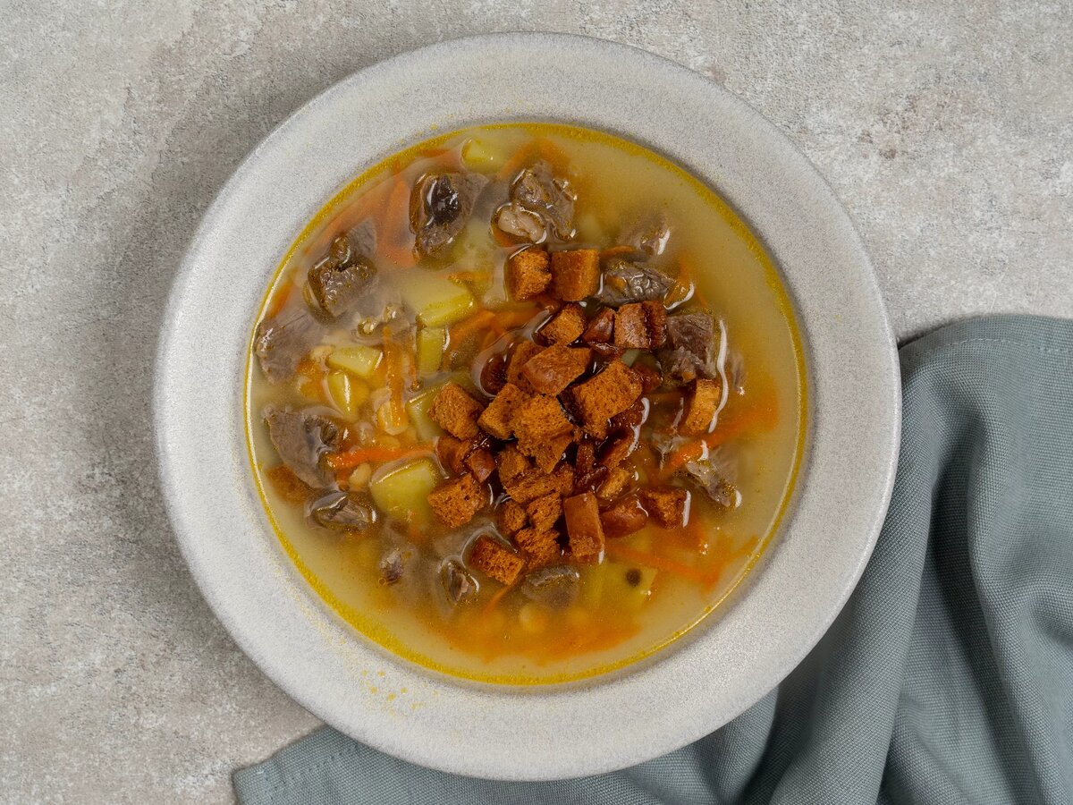 Разлейте гороховый суп по порционным тарелкам. Перед подачей посыпьте его сухариками. Приятного аппетита!