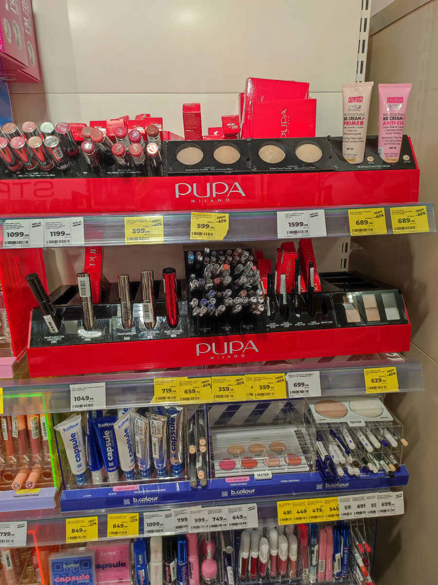 Я начала свой поход со стендов с декоративной косметикой.