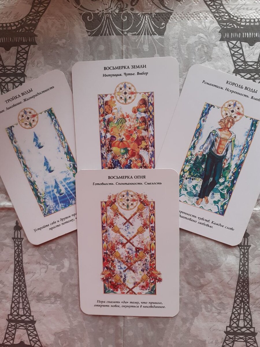 Тройка воды — Устройте себе и другим праздник! Просто так, просто потому, что Вы есть! "Чем больше Вы восхваляете и празднуете свою жизнь, тем больше в жизни можно праздновать" О. Уинфри "Любить себя - значит праздновать сам факт существования своей личности и быть благодарным за подарок жизни" Л. Хей Восьмёрка земли — Прислушайтесь к себе, только Вы знаете, как лучше для Вас! Интуиция поможет сделать верный выбор... Король воды — Поверьте в искренность чувств. Каждое слово продиктовано любовью... Есть некий молодой, дружелюбный мужчина, который влюблён в Вас, питает к Вам искренние, романтические чувства, которым можно верить... Восьмёрка огня — Пора сказать «да» тому, что пришло, открыть новое, окунуться в неизведанное, быть спонтанным и смелым!... Удачи!