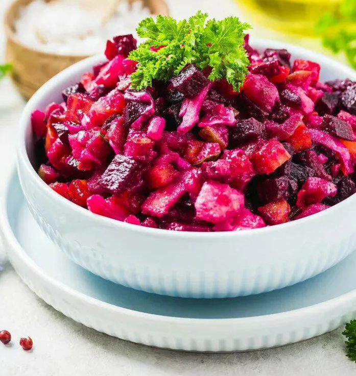 Заправьте салат растительным маслом и тщательно перемешайте. - Перед подачей на стол рекомендуется дать винегрету настояться в холодильнике хотя бы 30 минут, чтобы вкусы ингредиентов соединились.