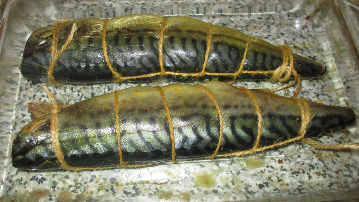 Ингредиенты: скумбрия - 4 рыбки; лимон-1 шт.; цедра лимона- 1 столовая ложка; соль- 2 столовые ложки без горки; сахар-1 чайная ложка; специи- по вкусу; опилки ольхи- 2 столовые ложки, духовка для копчения пищевых продуктов. Я готовила рыбу много раз, рецепт дан на 4 рыбки, но на фото может быть 2 Скумбрию разморозить, удалить голову плавники ( не обязательно) , внутренности, хорошо промыть , обсушить салфетками. В глубокую посуду насыпать соль, сахар, специи, цедру лимона, перемешать и этой смесью натереть каждую рыбку снаружи и внутри. Лимон порезать ломтиками и вложить в брюшко каждой рыбки. Скумбрию плотно уложить в стеклянную или эмалированную посуду, накрыть пищевой плёнкой и поместить в холодильник на 12 часов, я оставляю на ночь. К утру в посуде скапливается жидкость, её нужно слить, рыбу обсушить , поместив на решётку или салфетками. Готовые рыбки обвязать шпагатом, стараясь, чтобы лимоны оставались внутри. Опилки ольхи насыпать в духовку для пищевых продуктов,