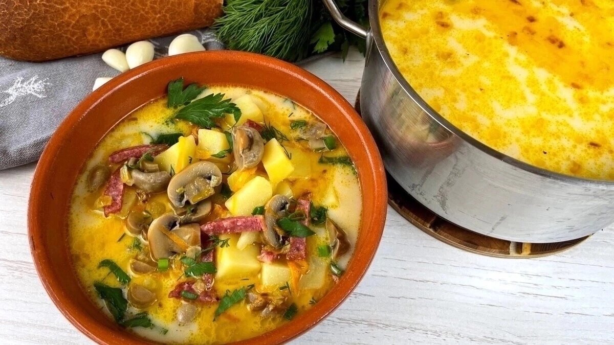 СЛИВОЧНО-ГРИБНОЙ СУП С САЛЯМИ Ингредиенты: ▪️вода — 2,5 л ▪️салями или сервелат — 250 гр ▪️лук — 1 шт ▪️морковь — 1 шт ▪️картофель — 4-5 шт ▪️сыр плавленный (баночка) — 180 гр ▪️шампиньоны консервированные — 425 мл ▪️соль, перец — по вкусу ▪️зелень — пучок Способ приготовления: 1️⃣ Поставьте кастрюлю с водой на плиту, посолите. Пока вода закипает, подготовим овощи. 2️⃣ Чистим лук, морковь и картофель. Затем лук нарезаем небольшим кубиком, а морковь трем на крупной терке. Не забываем нарезать шампиньоны. 3️⃣ Картофель нарежьте кубиками и отправьте в кипящую воду. 4️⃣ Лук обжарьте до прозрачности в небольшом количестве масла, добавьте морковь и шампиньоны. 5️⃣ Нарежьте салями и добавьте в зажарку, прогрейте все вместе ещё минут пять и выключите огонь. 6️⃣ В кипящую воду с картошку добавьте сыр, перемешайте до полного растворения, добавьте зажарку и доведите до кипения. Солим, перчим, выключаем огонь и даём настояться пару минут под крышкой. 7️⃣ Суп готов, подавайте с зеленью!