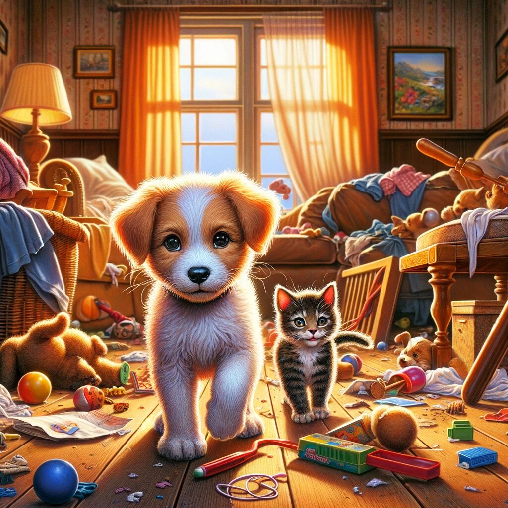 В одном уютном домике на окраине города жили лучшие друзья — щенок по имени Барни и котенок по имени Мурка. Они обожали играть вместе, превращая каждый день в настоящее приключение. Их любимые игры были такими веселыми и бурными, что после них вся комната превращалась в настоящее поле битвы: разбросанные игрушки, перевернутые миски и подушки, которые, казалось, разлетелись в разные стороны сами по себе. Но была одна проблема — после игр Барни и Мурка никогда не убирались. Они считали, что уборка — это скучно и лишает их времени для новых игр. "Убираться может кто-то другой, а мы здесь для веселья!" — весело говорил Барни, а Мурка, лишь мяукнув, соглашалась. Однажды, после особенно шумной игры в догонялки, щенок и котенок устали и решили немного отдохнуть. Когда они проснулись, то обнаружили, что не могут найти свои любимые игрушки. Все было таким перепутанным и загроможденным, что даже начать искать было сложно. "Где мой любимый мячик?" — с тревогой спросил Барни. "А где моя пушистая м