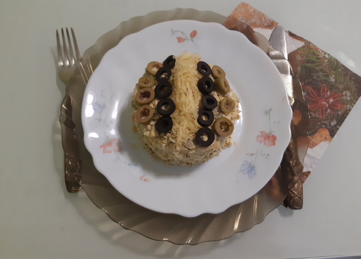 Состав: Для украшения по 3- 4 шт. маслин (зелёные и чёрные) Формовочные кольца диаметром 9см. 2 шт. С этого количества продуктов у меня получилось два порционных салата Приготовление: Лук нарезать полукольцами и припустить на сковороде с подсолнечным маслом (слегка обжарить), посолить. На порционной тарелке (на которой будет подаваться салат) в формовочные кольца, выкладываем слоями /хорошо утрамбовываем каждый слой/ : - лук обжаренный, слегка смазываем майонезом; - куриное мясо отварное, мелко нарезанное, утрамбовываем -и смазываем майонезом; - белки яйца натёртые на крупной тёрке, утрамбовываем и смазываем майонезом; - яблоко, мелко нарезанное, утрамбовываем; - сыр , натёртый на мелкой тёрке (половину , остальной для украшения) Ставим в холодильник на 30 минут. Достаём, снимаем кольца. Сверху и с боков посыпаем натёртыми желтками и ложечкой распределяем по стенке салата. (ведём с низу в верх, они прилипнут к салату) Края тарелки протираем салфеткой. Украшаем салат: