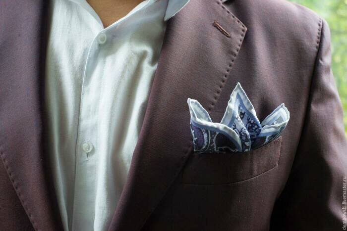 Метод «Облако». Самый неформальный способ складывания платка-паше. Лучше всего использовать шелковые аксессуары, так как они делают платок легким и воздушным. Возьмите платок за середину и сформируйте из него сверху «облако», сжимая его рукой. Затем заверните свободные края платка внутрь кармана, оставив «облако» сверху.