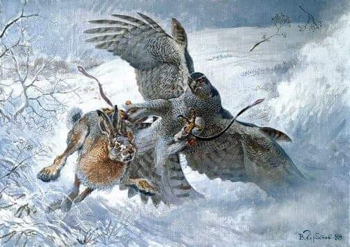 Еще на заре создания русского государства #сокол появляется как гербовая фигура, символ основателя династии первых князей Руси. Историк О. М. Рапов говорит, что «загадочные фигуры на монетах и печатях Рюриковичей, на перстнях и подвесках, принадлежавших князьям и их дружинникам, и даже на кирпичах Десятинной церкви в Киеве не что иное, как силуэт атакующего сокола. По некоторым, однако, спорным данным, само слово #Рюрик, #Рериг и даже #Рарог идентифицируется с названием сокола вообще или кречета, однако более вероятно его скандинавское происхождение. Постепенно интерес к соколиной охоте, и, прежде всего, со стороны новгородской знати, возрастал. Возрастала и потребность в охотничьих птицах. Спрос на них послужил тому, что начали появляться ловцы пернатых хищников. Ловля хищных птиц становится прибыльным делом. Именно в связи с тем, что ко времени появления первого свода законов так называемой «Русской Правды» интерес к ловчим птицам возрос настолько, что потребовалось особым пунктом внести статью о наказании за кражу этих птиц.