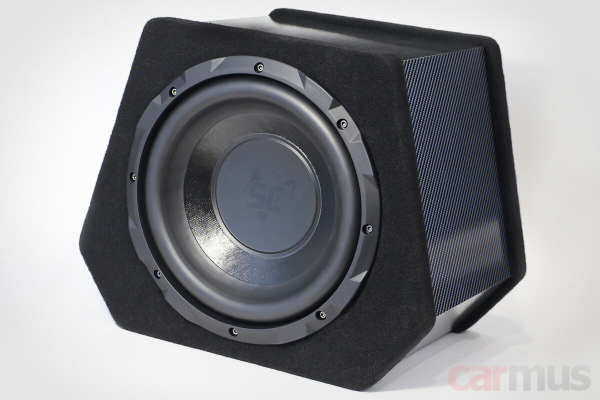 Корпус компактный, в форме симметричной трапеции со скошенными нижними углами. Максимальный размер в «бёдрах» – всего 38 см, высота – 31 см. Формат как бы намекает, что размещать его в багажнике логичней всего у спинки заднего сиденья, динамиком вбок.