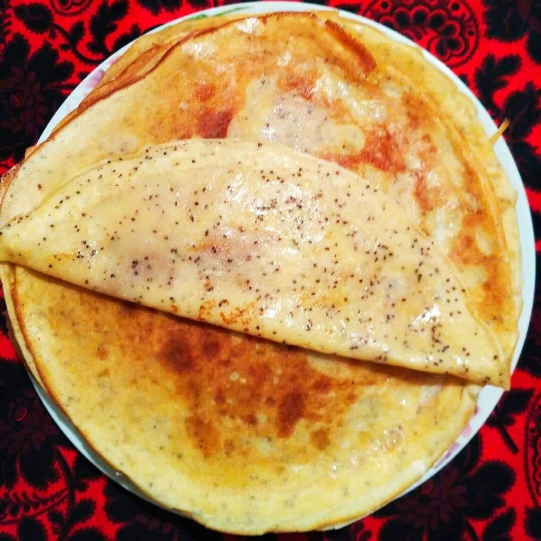 Блинчики на простокваше, с маком. Яйца, соль, сахар, ванильный сахар, взбить венчиком. Добавить простоквашу, снова взбить венчиком. Добавить лимонную цедру, сок лимона, соду, маковую начинку. Продолжая работать венчиком, ввести пшеничную муку, до консистенции жидкой сметаны. Добавить растительное масло. Дать тесту постоять 10 минут и выпекать блинчики, с двух сторон. Каждый блинчик смазывать сливочным маслом. Яйца - 3 шт Сахар - 3 ст ложки Соль - пол чайной ложки Ванильный сахар - небольшой пакетик Лимон - половина крупного лимона, на цедру и сок Сода - на кончике ножа Простокваша - 800 мл Маковая начинка, сухая, - пол стакана Масло растительное - 3 ст ложки Мука пшеничная - опционально. #блинчики #блинчикисмаком #тонкиеблины #едимдома #домашняяеда #домашняякухня