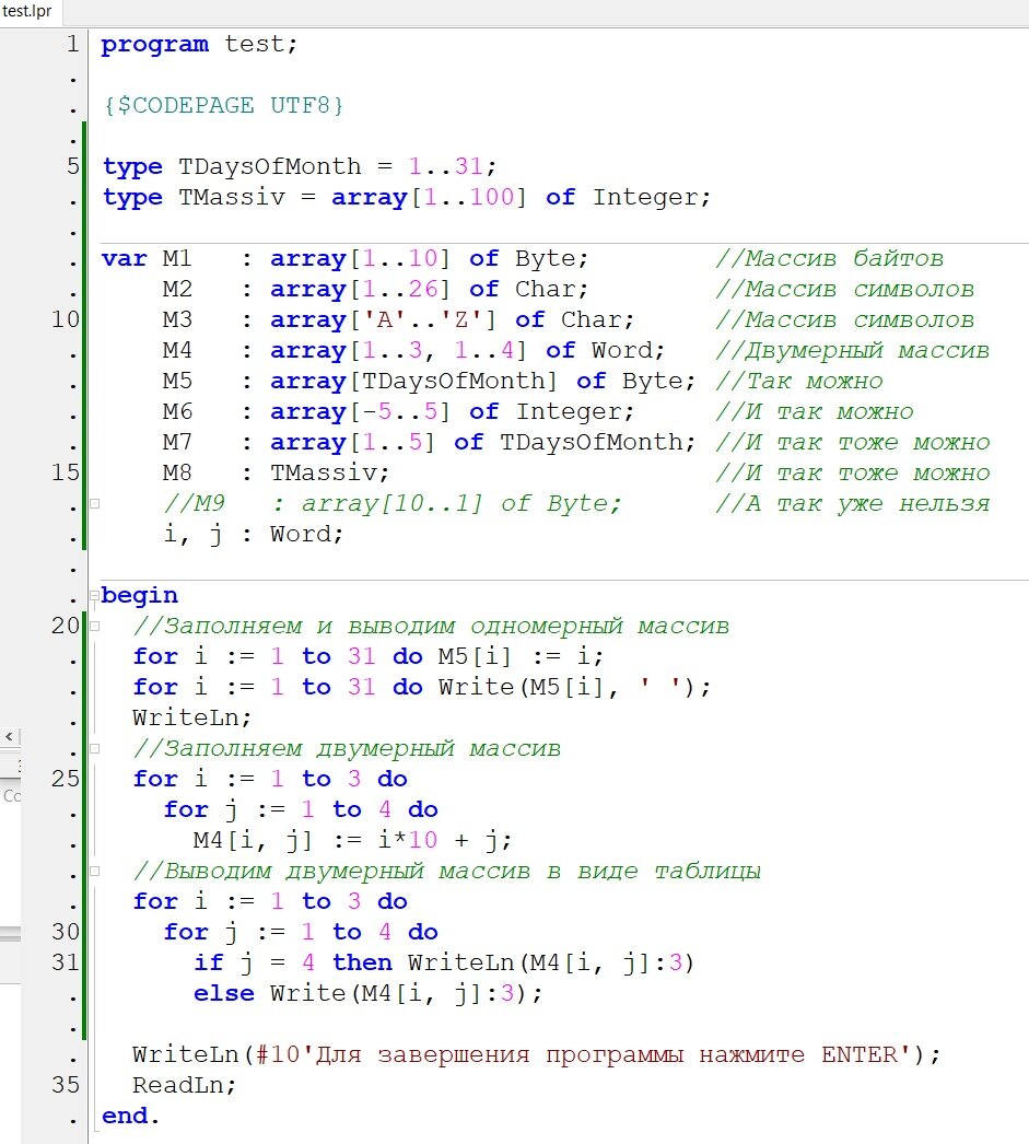 Этой статьёй я начинаю рассказ о структурированных типах данных. Структурированные типы - это данные, которые состоят не из одного, а из множества элементов. В Паскале это, например, массивы, записи, множества и файлы. Самый, пожалуй, простой и понятный - это массив - совокупность данных одного и того же типа (в Паскале, в некоторых других языках в массиве могут быть данные разных типов). Ну и, как всегда, напомню, что этот канал рассчитан, в основном, на начинающих, поэтому я обычно отбрасываю излишние подробности, а иногда даже жертвую точностью терминологии ради простоты. Для описания массива в Lazarus, как и в других реализациях Паскаля, используются слова array … of: ИмяМассива : array[СписокИндексов] of ТипДанных; Диапазон индексов массива определяется интервальным типом, например, так: M1 : array[1..10] of Byte; Здесь мы объявили массив байтов, который состоит из 10 элементов, и в котором индексы (номера) элементов находятся в диапазоне 1..10. Индекс массива в Паскале может на