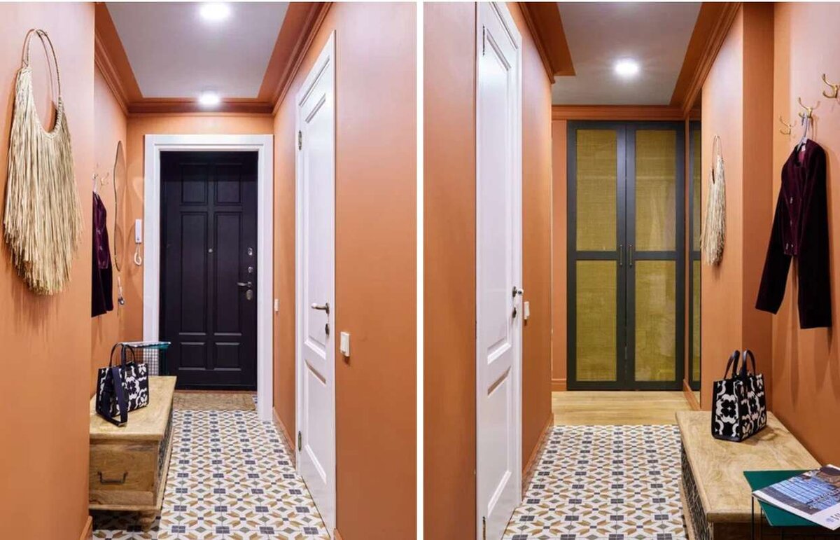 Яркие краски, красивая отделка, функциональный декор Прихожая в квартире дизайнера Эльнары Майыловой очень яркая и необычная. В ней много смелых и необычных решений. Дизайн и наполнение продуманы до мелочей. Рассказываем об особенностях оформления этого сочного и стильного помещения. Для покраски стен выбрали насыщенный терракотовый оттенок. Активный цвет уравновесили бледно-голубым потолком и белыми дверьми. Получилась спокойная обстановка, в которой комфортно находиться продолжительное время. Краска со стен на 10 см заходит на потолок, что визуально делает потолки выше. На полу — керамогранит с красивым геометричным принтом. Он визуально меняет узкое пространство, делает его динамичным и интересным. Изначально в квартире было две входных двери с небольшим пространством между ними. После установки новой качественной двери на вход от второй решили отказаться. Освободившееся место использовали как мини-тамбур, в котором удобно разуться и оставить обувь. В нем же располагаются электрощит