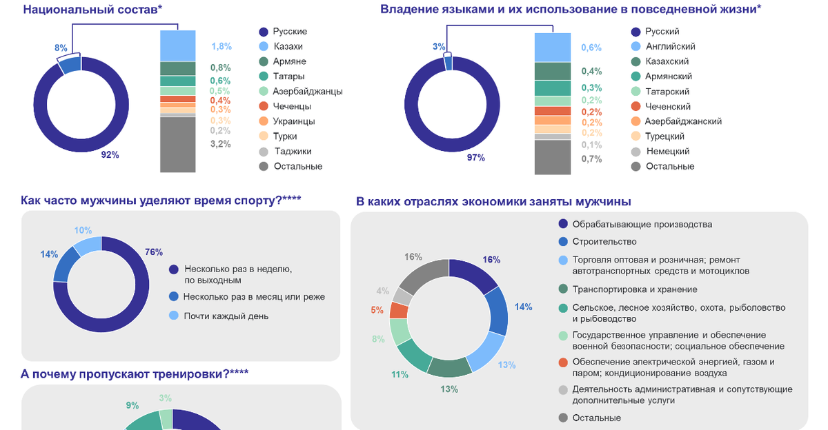 Волгоградстат представил портрет типичного мужчины, проживающего в регионе. Всего на начало 2023 года в Волгоградской области насчитали 1 156 700 мужчин, их 46,8% от общей численности населения области. Большая часть из —76,6% — городские жители, 23,4% проживают в сельской местности. Более половины мужчин (64,4%) в трудоспособном возрасте. Это 745 тысяч человек. На заслуженном отдыхе —17,7% мужчин, младше трудоспособного возраста — 17,9%. Средний возраст волгоградского мужчины на начало 2023 года составил 40 лет. По итогам Всероссийской переписи населения 2020 года, большинство мужчин в возрасте 16 лет и старше (64,5%) состоят в браке или сожительствуют. Никогда не были женаты 20,5%, официально разведенных, разошедшихся и вдовцов насчитали 15,0%. При этом 76% волгоградцев регулярно занимаются спортом несколько раз в неделю или по выходным. В регионе проживают представители более 100 национальных групп. Наиболее многочисленные среди них — русские — 91,9%. Далее следуют казахи 1,8%, армя