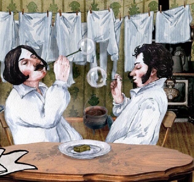 Однажды скучным воскресеньем, Соседской дрелью разбужен, Вдруг вспомнил, что на день рождения, Был Саша Колей приглашён. Закончив туалет мудрёный, Надел он праздничный сюртук, Погладил быстро панталоны, (Паршиво, ибо - близорук). В подарок взяв конфет коробку, Бутылку брюта и сигар, Наташу хлопнувши по попке, Ей покричал: "Оревуар!" Был сильный ветер и позёмка, Зима Москву всю замела, Крамского Вани Незнакомка В бульвар Никитский подвезла. Пообещав ей на досуге, Сходить вдвоём на тусу в клуб, На миг забыл он о супруге, Такой уж был он женолюб! А в это время злой уж Гоголь В тревоге о своей стряпне, Достал свой старенький бинокль, Глазами зыркая в окне. Галушки исходили паром, Шкварчит мясное фрикасе, Был Коля знатным кулинаром, Сподобил Бог и на безе. Он так готовился к банкету, И встречи тёплой двух мужчин, Уж дело близится к обеду, Эх Пушкин, что за сукин сын! Вздохнув, взял штопор, нож и вилку, И хлеба чёрного кусок, Откупорил вина бутылку, Вдруг долгожданнейший звонок!