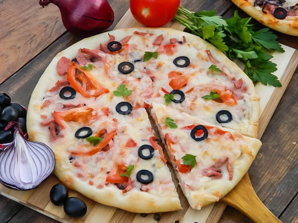 Равномерно распределите на тесте колбасу, лук, помидоры и маслины.