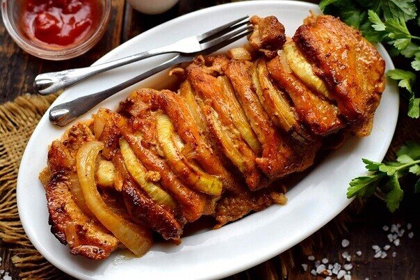 Свинина в пиве в духовке. Мякоть свинины пропитывается горчицей и специями, после запекается в виде порционных кусочков с луком в духовке. Вкус блюда получается достаточно оригинальным и необычным, благодаря темному пиву, в котором оно тушится. Именно пиво делает мясо очень мягким и сочным. Ингредиенты: Свинина (мякоть) – 1 κг. Лук – 2 шт. Горчица – 3 ч.л. Паприка сладкая – 1 ч.л. Паприка копченая – 1 ч.л. Растительное масло – 4 ст.л. Пиво темное – 200 мл. Соль, перец молотый – по вкусу Мякоть свинины нарежьте порционными слайсами средней толщины, одинакового размера. Мясо сложите в глубокую емкость, присыпьте солью, перцем, сладкой и копченой паприкой, добавьте обычную или дижонскую горчицу. Смесь тщательно перемешайте, чтобы специи полностью обволокли мясо. Маринуйте свинину в пряностях 1-2 часа. Чем дольше будет мариноваться мясо, тем вкусней, поэтому смело оставляйте его мариноваться на ночь. Через время головки лука очистите, нарежьте крупными полукольцами. Маринованное мясо выл