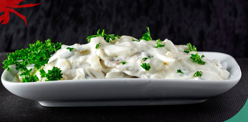 Ингредиенты: Для начала берем рыбное филе, отделяем от кожи и костей. Нарезаем кусочками. Берем миску, смешиваем уксус с водой и сахаром. После чего складываем рыбу в банку, заливаем маринадом, накрываем крышкой и оставляем в холодильнике на 6 часов. Рыба должна быть полностью покрыта жидкостью. Далее смешиваем майонез со сливками, горчицей, измельчённым чесноком, сахарной пудрой, уксусом и лимонным соком. Выливаем маринад. Смешиваем рыбу со сливочным соусом и убираем в холодильник на сутки. Перед подачей ещё раз перемешиваем и добавляем немного лука, нарезанного небольшими кусочками. Блюдо готово. Приятного аппетита! Источник: https://wildcrab.ru/news?id=2334