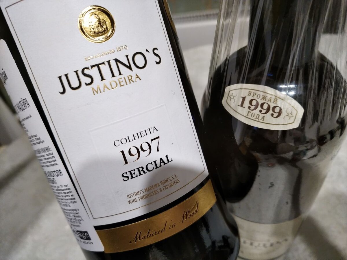 Праздничное сравнение. Поздравляю всех защитников Отечества! В порядке старшинства представляю участников сравнения: Justino's Madeira Colheita 1997 Sercial - всё указано на этикетке. И что урожай одного года (colheita), и что из винограда сорта серсиаль. Алкоголь 20%. А что не указано на португальской, возьмём с русской: розлив в октябре 2021, содержание сахара 56 граммов на литр. Купил в Winehelp за 7340 рублей, когда давали скидку. Выдержка в бочках около 20 лет. Срок хранения в бутылке можно не считать. "Мадера Массандра" - урожай 1999 года, виноград сортов альбийо, вердельо, серсиаль, алкоголя 20%, сахара 32гр/л, дата переукупорки перед выпуском в продажу 14.07.2017. В погребах "Массандндры" дополнительно выдерживалась 12 лет в бутылке, так что можно подсчитать, что в бочках выдерживалась до 2005 года, то есть, около 6 лет. Хранение в бутылке 19 лет, до откупоривания в январе 20024 года. И в данном случае его не считать нельзя, в нём весь смысл. Купил года 3-4 назад за 7300 рубле