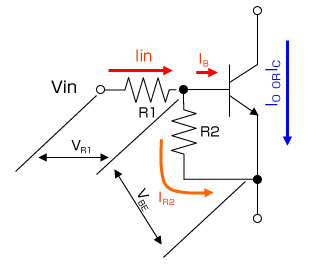 ∴ Ic= 20×((Vin-VBE)/R1 )- (VBE/R2 ))・・・(2)